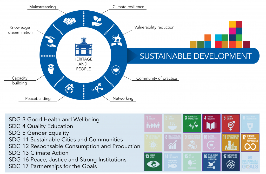 The programme promotes a systems-based approach to heritage and strengthens its links to the social and environmental dimensions of sustainable development. Its strategy considers risk drivers, such as climate change and variability, armed conflicts and socioeconomic instabilities.